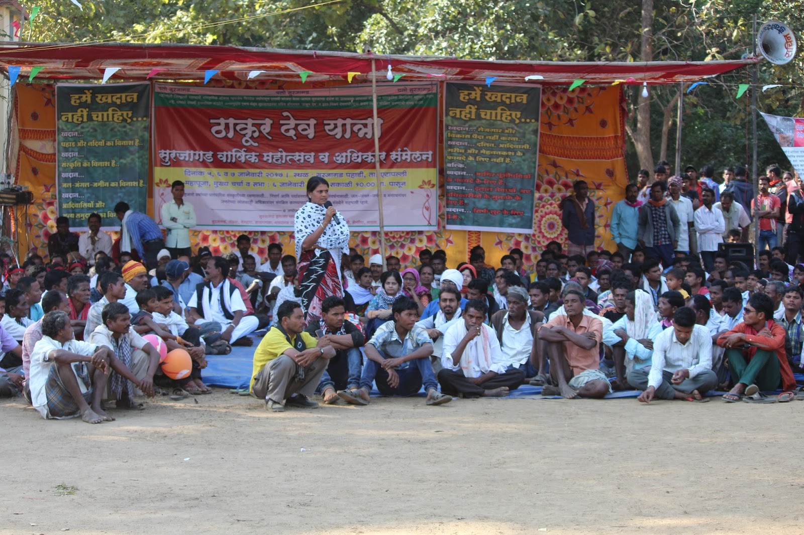 जल-जंगल-जमीन, डोंगर-पहाड, नदी-नाले ये ही हमारी असली संपदा है, इन्ही नदी-पहाड़ो में हमारे भगवान है, हमारे श्रद्धास्थल है. वन संसाधनों पर आधारित रोजगार और देवी-देवतायों के सहवास के वजह से ही यहाँ की संस्कृती और आदिवासींयों की संपन्नता टिकी हुई है. विकास के नाम पर पुरे गडचिरोली जिल्हे में अगर खदाने होती है तो भारी मात्र में वन नष्ट हो जायेंगे.स्थानिक आदिवासी एवं अन्य समुदायों को विस्थापन की मर जेलानी पड़ेगी. इसीलिये गडचिरोली जिल्हे में शुरू की गयी और प्रस्तावित सभी खदानों को तुरंत रद्द किया जाये ये ऐलान गडचिरोली जिल्हे के एटापल्ली तहसील में सुरजागड़ पहाड़ क्षेत्र मेंआयोजित “ठाकुर देव यात्रा, सुरजागड़ वार्षिक महोत्सव एवं अधिकार सम्मेलन” में किया गया. विस्थापन,जनविरोधी विकास नीतियों के खिलाफ जनतांत्रिक संघर्ष को और भी मजबुत बनाने का हुआ आगाज. संस्कृती की रक्षा के लिए, जल-जंगल-जमीन,संसाधनों पे अधिकार के लिए, जन केन्द्रित विकास के निर्माण के लिए, मुक्ति के संघर्ष को आगे ले जाने का संकल्प हजारों की तादात में जमा हुयी जनता द्वारा लिया गया.