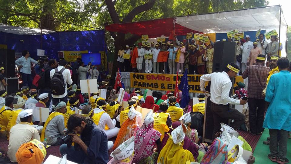 नई दिल्ली, 25 अक्टूबर 2016; जीएम सरसों को वाणिज्यिक रूप से जारी करने पर प्रतिबंध की मांग करने के लिए 20 राज्यों के 118 संगठनों के प्रतिनिधियों ने आज जंतर मंतर पर विरोध प्रदर्शन किया।