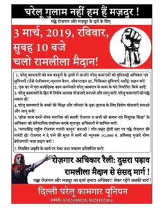 जिस दिन का हम सब बड़ी बेसब्री से इंतज़ार कर रहे थे वह दिन आ गया है। आनेवाली 3 मार्च को दिल्ली के घरेलू कामगारों की हुंकार से संसद हिल उठेगी । देश भर के मज़दूरों, छात्रों-नौजवानों और बेरोजगारों के साथ हम दिल्ली के घरेलू कामगार अपनी माँगों का झंडा बुलंद करेंगे। 3 मार्च को रामलीला मैदान से संसद मार्ग तक हमारे हक़ और अधिकारों की माँग का डंका बजेगा । 3 मार्च वह दिन है , जब हमें मोदी सरकार की नींद उड़ा देनी है।