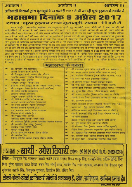 संघर्ष के सिलसिले में 24 फरवरी से 29 मार्च 2017 तक यानी 34 दिन तक किसानो के द्वारा क्रमिक भूख हड़ताल की गई। चौतरफा दबाव से आखिर जिला प्रशासन ने आंदोलनकारी किसानों से चर्चा की और चर्चा के दौरान यह कहा कि हम यह स्वीकार करते हैं कि भूमि अधिग्रहण हेतु की गई कार्यवाही में व्यापक अनियमितता की गई है हम दोषपूर्ण अधिग्रहण की कार्यवाही को निरस्त किए जाने हेतु मध्य प्रदेश सरकार को अपनी तरफ से प्रतिवेदन भेजूंगा तथा जिन 10 आदिवासियों के बंटन के पट्टे को निरस्त किया गया है उसे बाहाल कर दूंगा और बाद जाँच फर्जी ग्राम सभा के लिए दोषी ठहराए गए सचिव के खिलाफ पुलिस को FIR हेतु पत्र लिखूंगा। जिला प्रशासन के इस वादे के अनुसार भूख हड़ताल आंदोलन को स्थगित कर घोषणा की गई कि 9 अप्रैल 2017 को महासभा कर प्रशासन के वादे की समीक्षा की जाएगी और आगे की योजना पर निर्णय किया जायेगा।