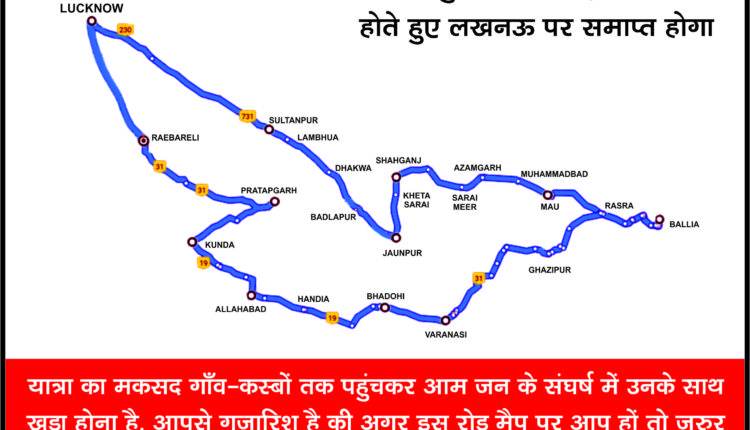 उत्तर प्रदेश में संविधान, लोकतंत्र, सामाजिक न्याय के लिए संघर्षरत गांव-कस्बों के आंदोलनों के साथ कंधे से कंधा मिलाकर चलने के लिए अभियान का आयोजन किया जा रहा है। यह अभियान यूपी में चार चरणों में होगा। पहला चरण बृहस्पतिवार, 30 अगस्त 2018 से लखनऊ से प्रारम्भ होकर सुल्तानपुर, जौनपुर, आज़मगढ़, मऊ, बलिया, गाज़ीपुर, वाराणसी, भदोही, इलाहाबाद, प्रतापगढ़, रायबरेली होते हुए बुद्धवार, 5 सितंबर को लखनऊ में समाप्त होगा। गांव-कस्बों से होते हुए कोई दो हजार किलोमीटर का रास्ता तय किया जाएगा।