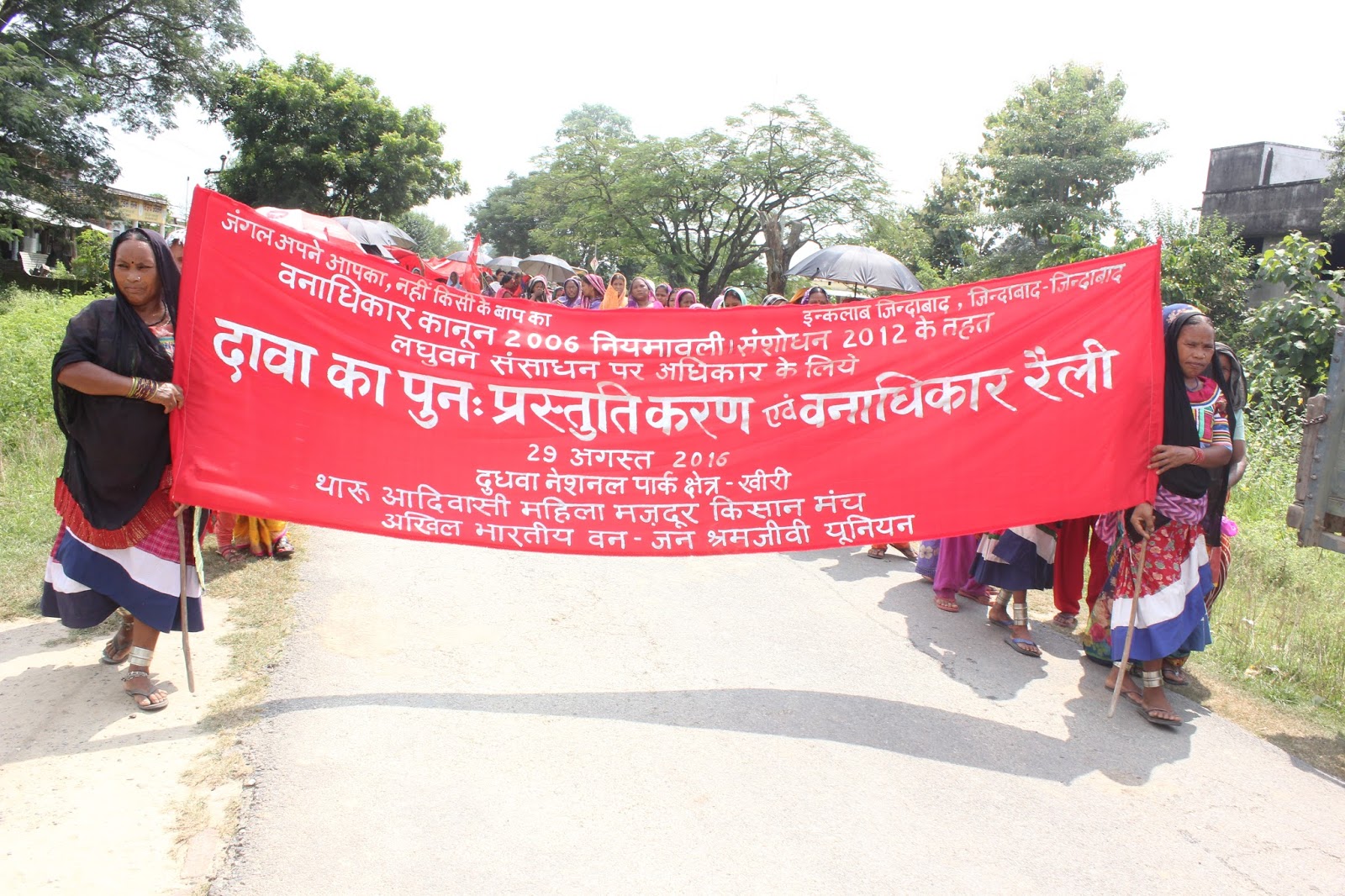 29 जुलाई 2016 को दुधवा नेशनल पार्क क्षेत्र पलिया कलां-खीरी के थारू जनजाति बहुल 18 गाॅवों की ग्राम स्तरीय वनाधिकार समितियों द्वारा थारू आदिवासी नेतृत्वकारी महिलाओं की अगुआई में हजारों की संख्या में दावाकर्ताओं ने एक भव्य पुनः दावाप्रस्तुतिकरण एवं वनाधिकार यात्रा निकाल कर दुधवा नेशनल पार्क व टाईगर रिज़र्व क्षेत्र चन्दन चैकी स्थित एकीकृत जनजातीय परियोजना कार्यालय में थारू आदिवासी महिला मज़दूर किसान मंच सम्बद्ध अखिल भारतीय वन-जन श्रमजीवी मंच द्वारा आयोजित दावा प्रस्तुतिकरण एवं वनाधिकार समारोह में पहुंच कर अपने दावों की फाईलें वहां मौजूद उपखण्ड स्तरीय वनाधिकार समिति के अध्यक्ष उपजिलाधिकारी पलिया श्री शादाब असलम को सौंपी। उपजिलाधिकारी द्वारा वादा किया गया कि इन दावों को 10 दिन के अन्दर निस्तारण कर जिलास्तरीय समिति को अग्रसरित किया जायेगा। इस समारोह में मुख्य अतिथि के रूप में अखिल भारतीय वन-जन श्रमजीवी यूनियन के राजनैतिक सलाहकार श्री धनंजय उपाध्याय शामिल रहे।
