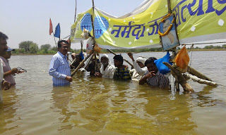 कई सालों से देश के किसान मुसलसल आत्महत्या कर रहे हैं लेकिन किसानों के इस देश में  यह एक मुद्दा तब बन पाया जब एक किसान का बेटा लुटियंस की दिल्ली में ठीक हुक्मरानों के  सामने खुदकशी कर लेता है। इसके बाद देश भर में भूमि अधि‍ग्रहण कानून और किसान आत्महत्या से जुड़े मुद्दे कुछ समय के लिए बहस के केन्द में तो आ जाते हैं लेकिन इसकी मियाद ज्यादा लम्बी नहीं होती है, व्यवस्था के चेहरे से गजेन्द्र के खून के छीटें अभी सूखे भी नहीं थे कि इधर मध्यप्रदेश में नर्मदा की संतानें अपने आप को रूह बनाने के लिए मजबूर हैं। खंडवा जिले के घोघलगांव में ओंकारेश्वर बांध क्षेत्र के डूब प्रभावित किसान पिछली 11अप्रैल से नर्मदा की पानी में अपना शरीर गलाते हुए प्रतिरोध कर रहे हैं और सैकड़ों लोग पानी से बाहर से उनका साथ दे रहे हैं। यह वही नर्मदा नदी है जिसे यहाँ के लोग प्यार और सम्मान से “नर्मदा मैया” कर के बुलाते है और जो सदियों से उनकी जीवन रेखा रही हैं, लेकिन विडम्बना देखिये कि हमारे सिस्टम ने सैकड़ों सालों से लोगों की पालनहार रही नर्मदा की धारा को उसकी आँचल में बसे लोगों के लिए जानलेवा बना दिया है, यह विस्थापन बनाम तथाकथित “विकास”  की लडाई है जिसमे जीत अक्सर “विकास” की ही होती है और जिनकी कीमत और नाम पर यह “विकास” होता है वह हार जाते हैं।