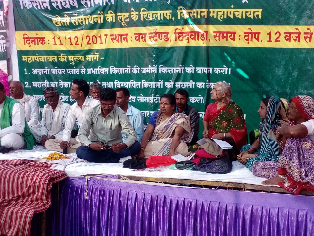 मध्य प्रदेश के छिंदवाडा में किसान संघर्ष समिति द्वारा 11 दिसम्बर 2017 को पेंच व्यपर्तन परियोजना और अड़ानी पॉवर प्लांट के विस्थापित गांवों के किसानों की महापंचायत का आयोजन किया गया, जिस में इन परियोजनों से विस्थापित 20 गांवों से हजारों किसानों ने भाग लिया। किसान महापंचायत को किसान संघर्ष समिति की उपाध्यक्ष एडवोकेट आराधना भार्गव, नर्मदा बचाओ आंदोलन की नेत्री मेधा पाटकर, सुरेश पटेल ने संबोधित किया। पढ़े किसान संघर्ष समिति की विज्ञप्ति;