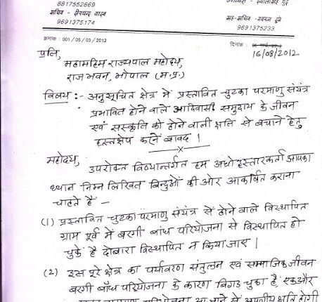 मंडला जिले की हरी-भरी धरती के सुदूर इलाक़े में छोटा सा आदिवासी गांव है- चुटका। तीन साल पहले तक नारायनगंज तहसील में ही इसे बहुत कम लोग जानते थे। आज यह गांव मंडला में ही नहीं, पूरे मध्य प्रदेश में जाना जाता है। राज्य के बाहर भी यह नाम यहां-वहां लोगों की ज़ुबान पर चढ़ने लगा है। उसकी इस शोहरत के पीछे कोई चमत्कारिक उपलब्धि नहीं है। सामने खड़ी पहाड़ जैसी आफ़त ने उसे सुर्ख़ियों में लाने का काम किया है। यह आफ़त परमाणु बिजली संयंत्र की प्रस्तावित परियोजना लेकर आयी है। प्रस्तावित परियोजना के विरोध में चुटका परमाणु संघर्ष समिति पिछले तीन साल से संघर्षरत है परंतु प्रशासन ने 29 जून को धारा 4 का नोटिस जारी कर दिया. इस नोटिस के विरोध में आज 16 अगस्त को राज्यपाल को ज्ञापन दिया गया है. चुटका परमाणु संघर्ष समिति का ज्ञापन :-