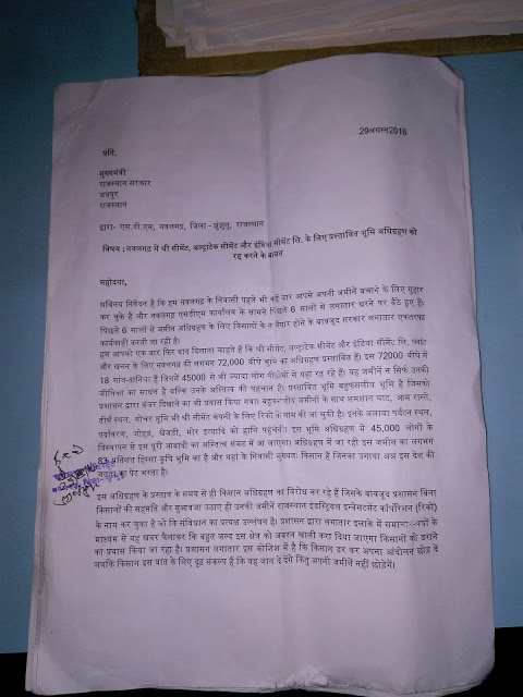 विषय : नवलगढ़ में श्री सीमेंट, अल्ट्राटेक सीमेंट और इंडिया सीमेंट लि. के लिए प्रस्तावित भूमि अधिग्रहण को रद्द करने के बाबत