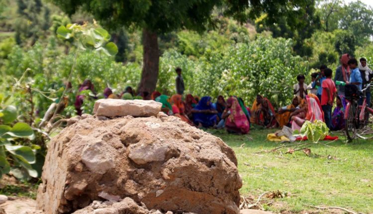 | अधूरा पिलर, जिससे वन क्षेत्र को घेरा जाना है और उसके पीछे कंपनी के खिलाफ गोलबंद अमिलिया की औरतें |