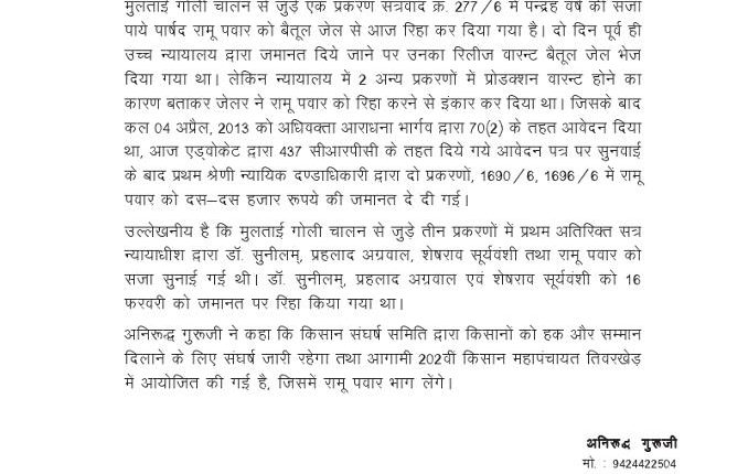 किसान संघर्ष समिति के महामंत्री अनिरूद्ध गुरूजी ने जारी प्रेस विज्ञप्ति में बताया कि मुलताई गोली चालन से जुड़े एक प्रकरण सत्रवाद क्र. 277/6 में पन्द्रह वर्ष की सजा पाये पार्षद रामू पवार को बैतूल जेल से रिहा कर दिया गया है। दो दिन पूर्व ही उच्च न्यायालय द्वारा जमानत दिये जाने पर उनका रिलीज वारन्ट बैतूल जेल भेज दिया गया था। लेकिन न्यायालय में 2 अन्य प्रकरणों में प्रोडक्शन वारन्ट होने का कारण बताकर जेलर ने रामू पवार को रिहा करने से इंकार कर दिया था। जिसके बाद 04 अप्रैल, 2013 को अधिवक्ता आराधना भार्गव द्वारा 70(2) के तहत आवेदन दिया था, एड्वोकेट द्वारा 437 सीआरपीसी के तहत दिये गये आवेदन पत्र पर सुनवाई के बाद प्रथम श्रेणी न्यायिक दण्डाधिकारी द्वारा दो प्रकरणों, 1690/6, 1696/6 में रामू पवार को दस-दस हजार रूपये की जमानत दे दी गई।