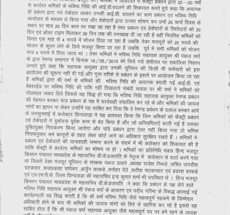 मजदूर किसान पंचायत के बैनर तले जिला कलेक्टर को एक ज्ञापन दिया है जिसमें फैक्ट्री प्रबंधन द्वारा 20-20 वर्षों से कार्यरत श्रमिकों के भविष्य निधि की आईडी बदलने, ठेकेदारों