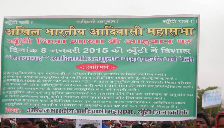 झारखण्ड के खूंटी जिले में 8 जनवरी 2015 को आबा भगवान बिरसा मुंडा की जन्मस्थली पर भारी बारिश और तूफान के बीच भारी संख्या में आदिवासियों ने पांचवी अनुसूचि, सीएनटी एक्ट, एसपीटी एक्ट, पेसा कानून और आदिवासी अधिकारों की रक्षा के लिए एकजुट हुए और सरकार को चेताया कि आदिवासियों के साथ अन्याय बर्दाश्त नहीं किया जाएगा।