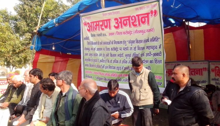 देश की राजधानी से मुश्किल से 50 कि.मी. की दूरी (जिला कलैक्ट्रेट परिसर, गौतमबुद्ध नगर) पर किसान अपनी ज़मीन बचाने के लिए लगातार 01 जनवरी 2014 से आमरण अनशन पर बैठे है। इन किसानों की उत्तर प्रदेश राज्य औद्योगिक विकास निगम, अम्बुजा सीमेन्ट, बिरला सीमेन्ट, अंसल बिल्डर